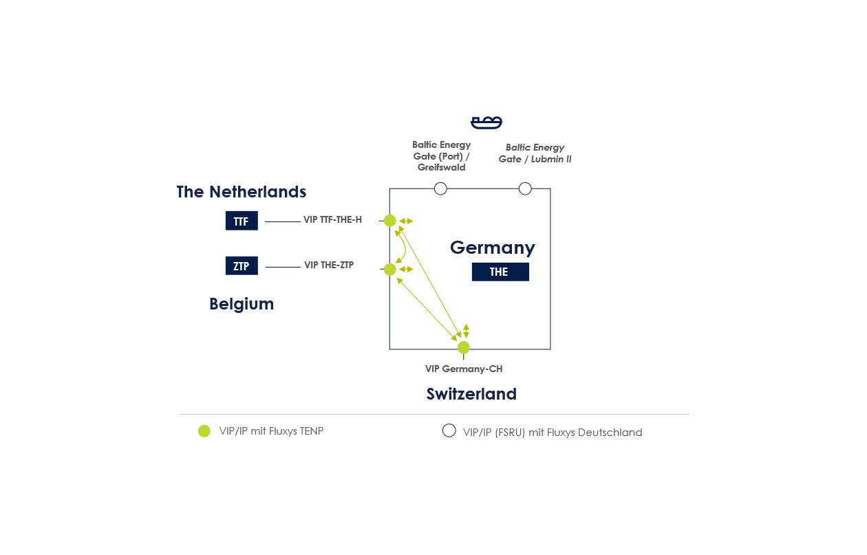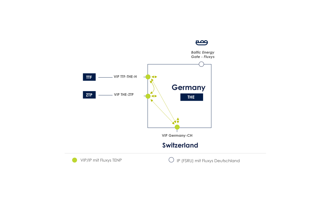 Darüber hinaus ist die TENP ist über den VIP THE-ZTP und das belgische Transportnetz mit den LNG-Terminals der Fluxys-Gruppe in Zeebrugge (Belgien) und Dunkerque (Frankreich) verbunden. Damit schafft die Pipeline schon heute die Voraussetzungen für den effizienten Transport von LNG nach Deutschland und trägt wesentlich zur Diversifizierung der deutschen Energieversorgung bei.