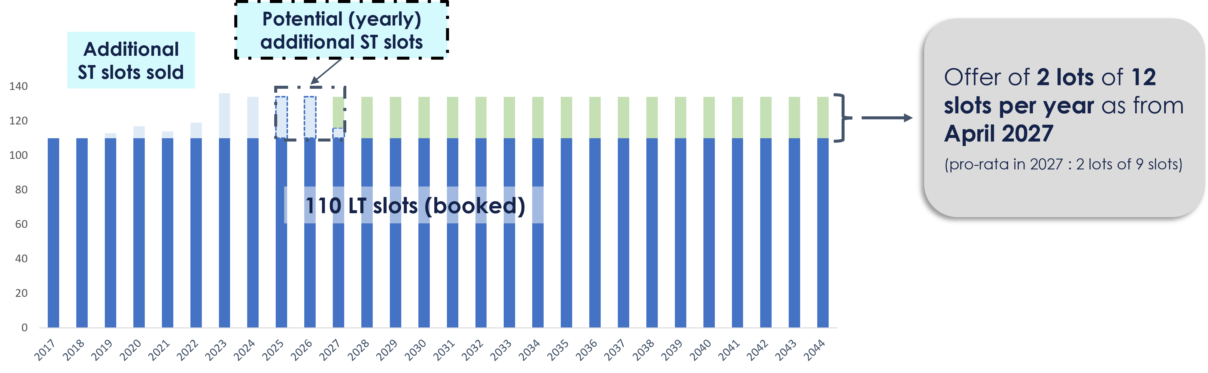 In order to address such long-term demand, Fluxys LNG has decided to convert its current short-term offering of additional slots (offered the last few years on a yearly or monthly basis) into long-term capacities and consequently, increasing the nameplate long-term regasification capacity of the Zeebrugge Terminal from 110 to 134 slots per year as of April 2027.