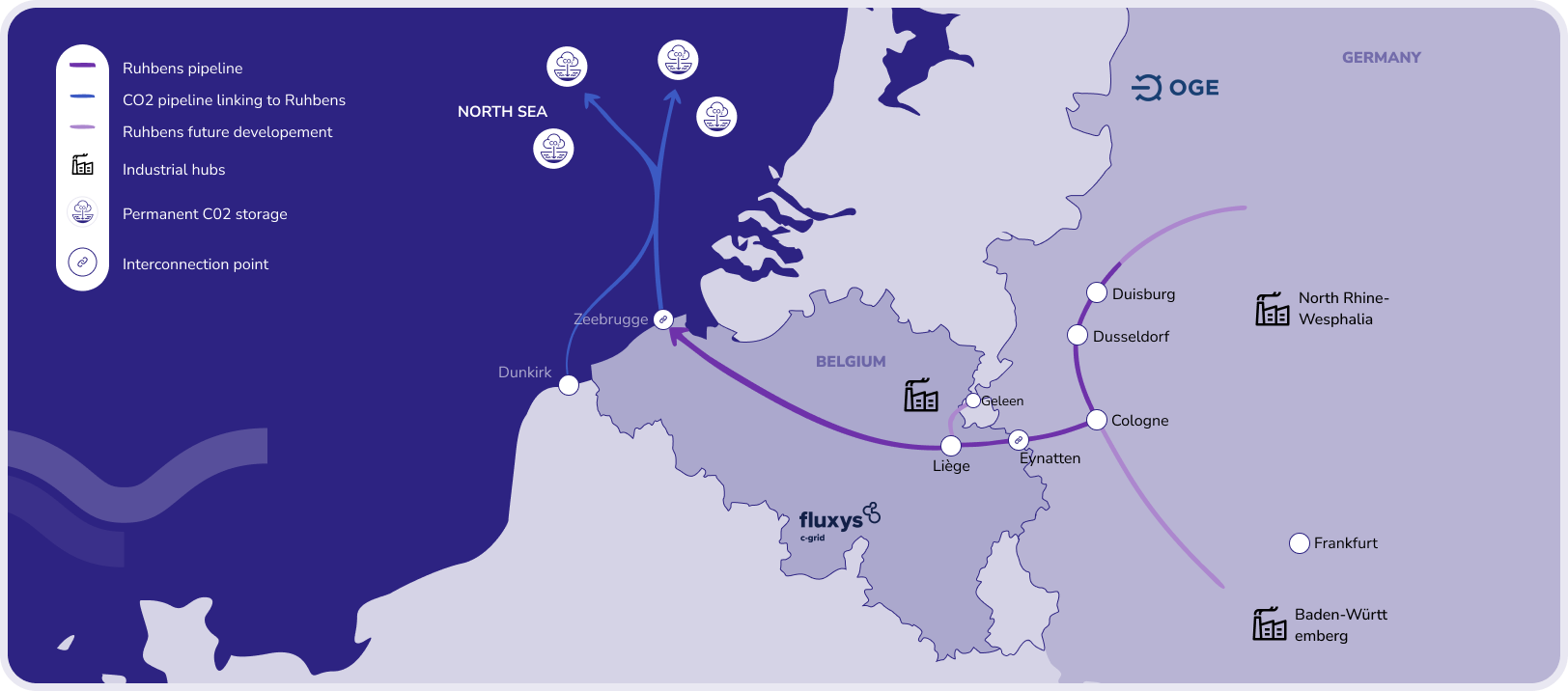 Das Projekt Ruhbens – der Name steht für Ruhrgebiet, Belgien und Nordsee – wird eine wichtige Transportroute für CO₂ bilden. Über diese werden die deutschen Industriegebiete mit dem Exportknotenpunkt Zeebrugge verbunden und erhalten so Zugang zu mehreren Standorten für die dauerhafte geologische Speicherung in der Nordsee.