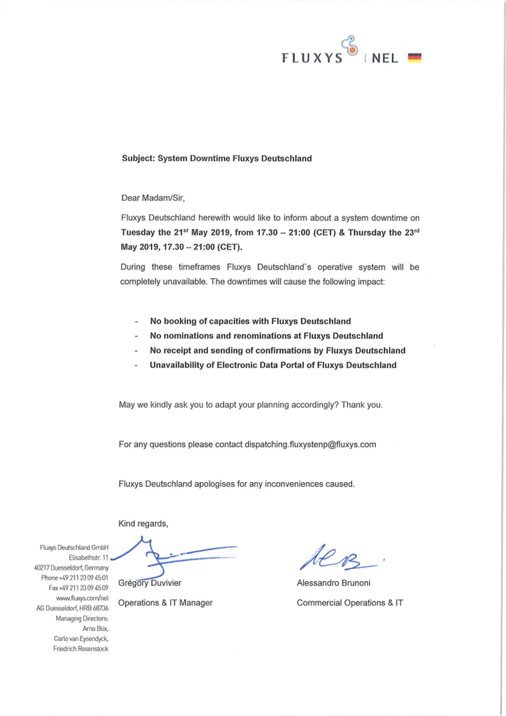 Fluxys Deutschland operative System Downtime on 21. And 23. May 2019