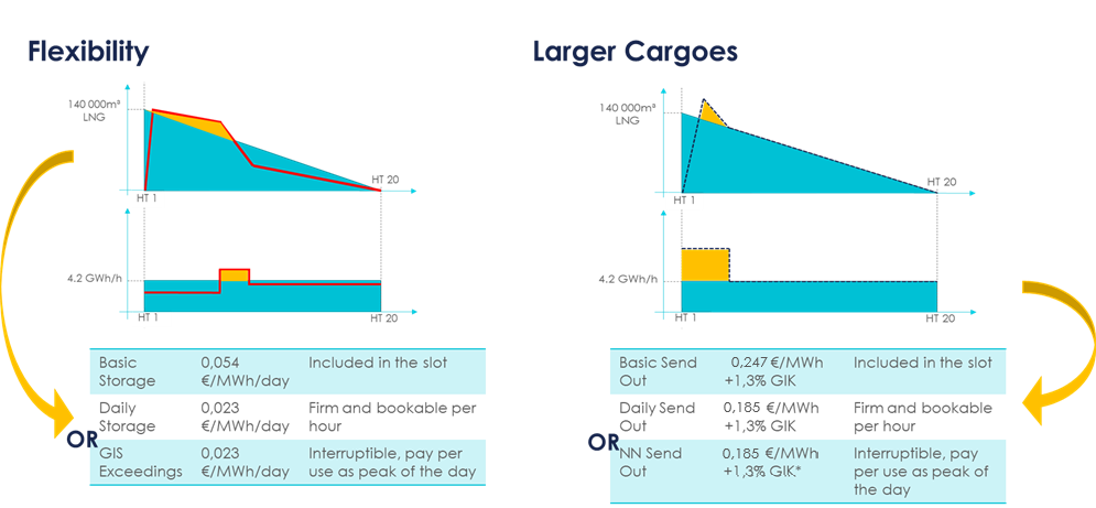 Relative costs are lower for larger cargoes, because Berthing costs are volume independent and the tariffs for additional send out and storage are cheaper than the basic send out.