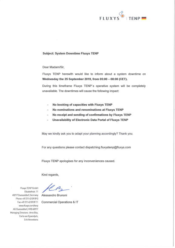 Fluxys TENP operative System Downtime on 25 September 2019