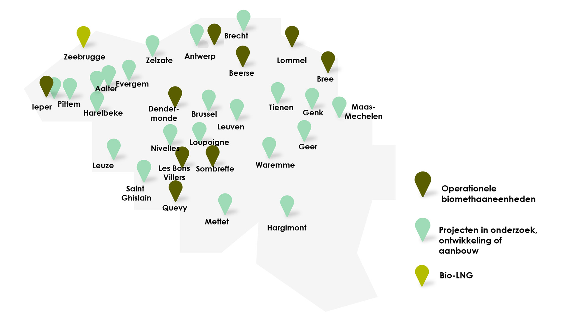 In België komt de productie van biomethaan stilaan op gang. Er zijn momenteel tien biomethaaninstallaties operationeel en ongeveer 20 projecten bevinden zich in verschillende stadia van onderzoek, ontwikkeling of bouw. De LNG-terminal in Zeebrugge maakt bio-LNG beschikbaar voor de markt.