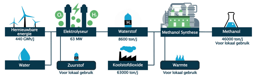 North-C-Methanol is een knap staaltje van duurzame industriële symbiose: de grondstoffen worden lokaal gewonnen én de eindproducten en nevenstromen lokaal ingezet. In North Sea Port wordt een eigen nieuwe circulaire economie gecreëerd: afval van het ene bedrijf vormt grondstof voor een ander bedrijf. Alle nevenproducten van de methanolproductie zoals zuurstof, warmte en water worden ook lokaal hergebruikt. Dat zorgt voor een unieke en ver doorgedreven industriële én circulaire integratie. Uiteraard gaat dit geheel gepaard met de bouw van heel wat ondersteunende infrastructuur zoals nieuwe pijpleidingen en opslagtanks om grondstoffen, neven- en eindproducten op de juiste locatie te brengen. Fluxys en Oiltanking zullen hiervoor instaan. Mitsubishi Power zorgt voor de integratie en coördinatie van het hele bouwproces.